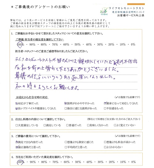 ライフセレモニートラストでは、葬儀を終えられたご遺族の方にアンケートにご協力いただき、より良いサービスの提供に努めております。