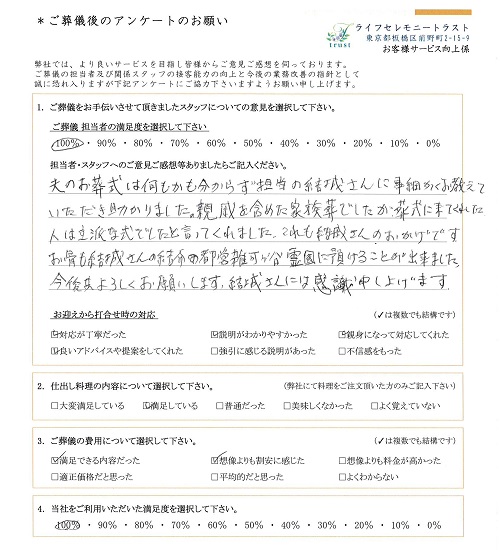 夫のお葬式は何もかも分からず、担当の結城さんに事細かくお教えていただき助かりました。親戚を含めた家族葬でしたが葬式に来てくれた人は立派な式でしたと言ってくれました。これも結城さんのおかげです。お骨も都営雑司ヶ谷霊園に預けることができました。