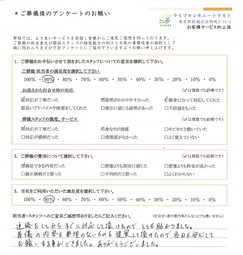 ライフセレモニートラストでは、葬儀を終えられたご遺族の方にアンケートにご協力いただき、より良いサービスの提供に努めております。