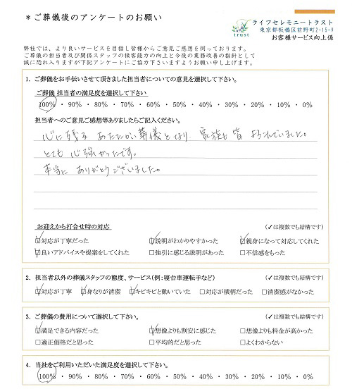 ライフセレモニートラストでは、葬儀を終えられたご遺族の方にアンケートにご協力いただき、より良いサービスの提供に努めております。